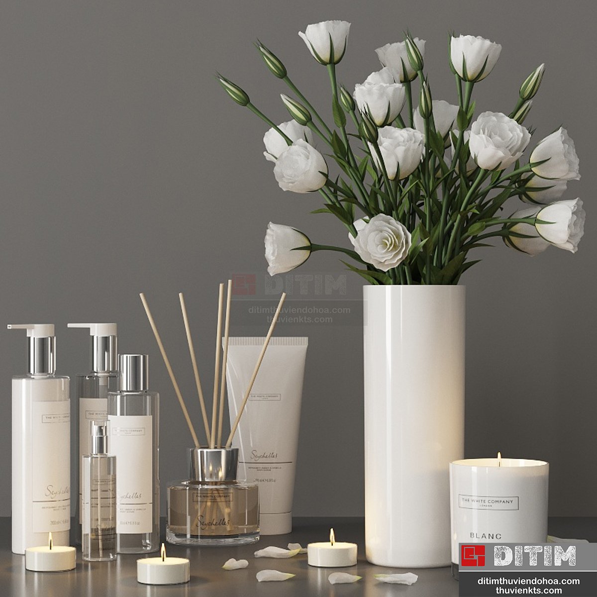 | • Tên file 3dsmax: | Decorative set with a bouquet of lisianthus and cosmetics |
